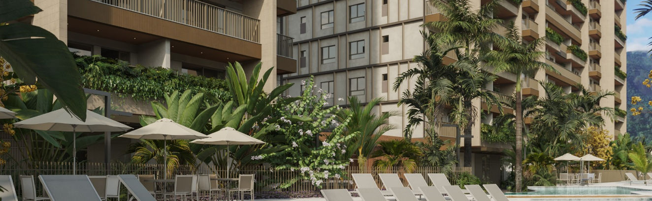 Rooftop com piscina e paisagismo exuberante